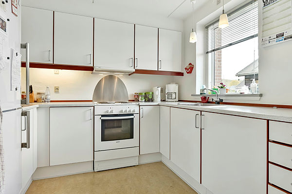 Der er faste garderobeskabe i soveværelse, entre og i nogle af værelserne. Der er opsat Invita køkken med glatte låger i vanillafarve samt forberedt for installation af opvaskemaskine og køleskab (max 55 cm bredt). Der er komfur med plader og ovn samt emhætte. Der er ligeledes forberedt installation til vaskemaskine og kondenstørretumbler. Der er lyse klinker i bryggers og badeværelset. I køkken er der linoleumsbelægning. I de øvrige rum er der parketgulve.